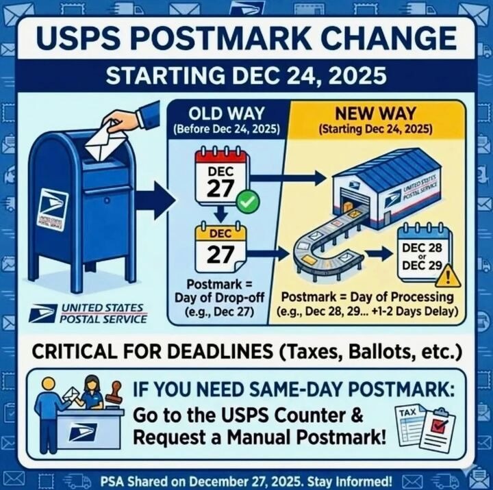 USPS is formally defining what a machine-applied postmark date represents. A machine-applied postmark reflects when a mailpiece is processed at a USPS processing facility, not necessarily the day it was dropped in a mailbox, collected locally, or accepted at a Post Office.