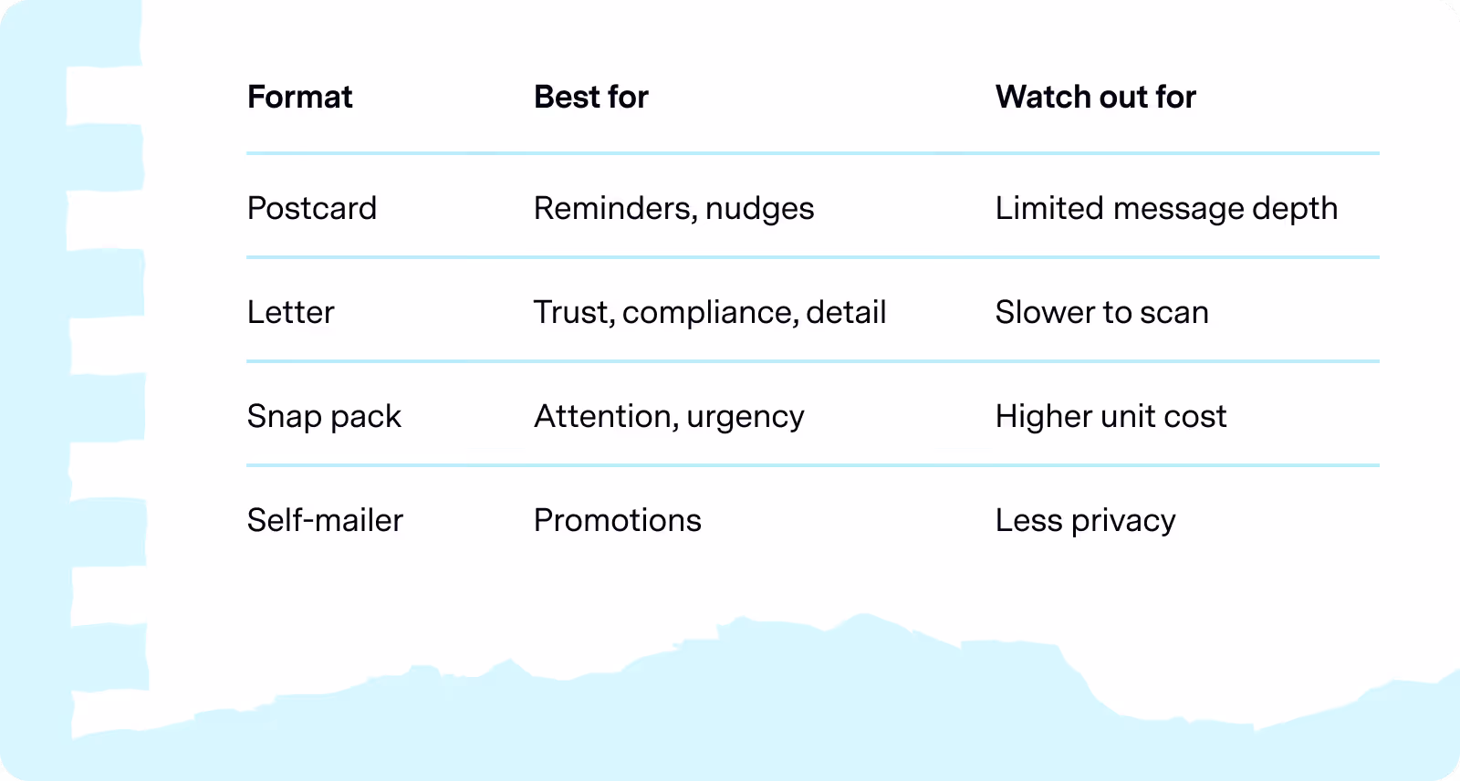 Format choice is a strategic decision, not a creative one. Different formats signal different things—urgency, trust, depth, or ease. Optimized programs choose formats intentionally based on the job the mail needs to do.