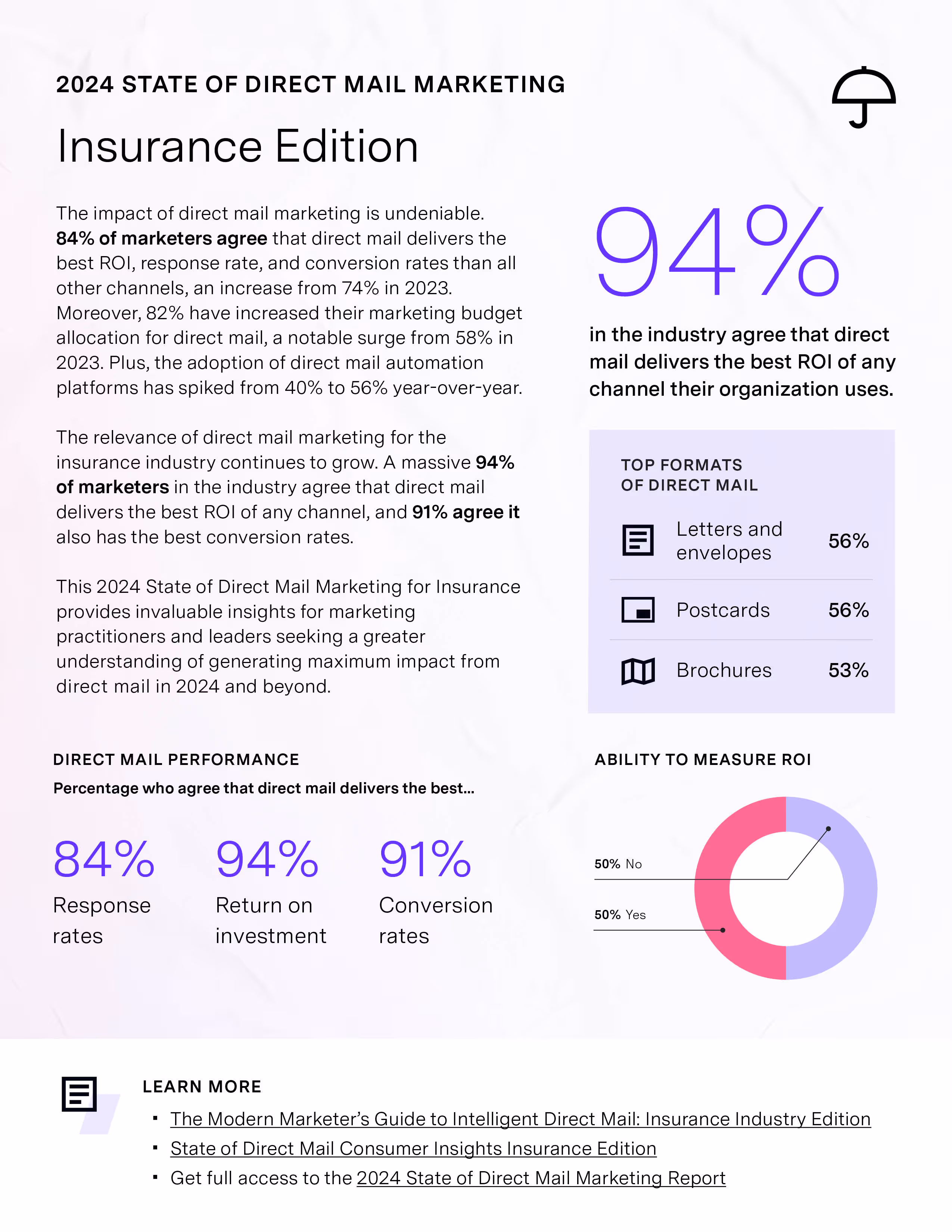 You’re in the business of insuring your customers and we’re in the business of ensuring direct mail results. In fact, 94% of marketers in the insurance industry agree that direct mail delivers the best ROI of any channel.