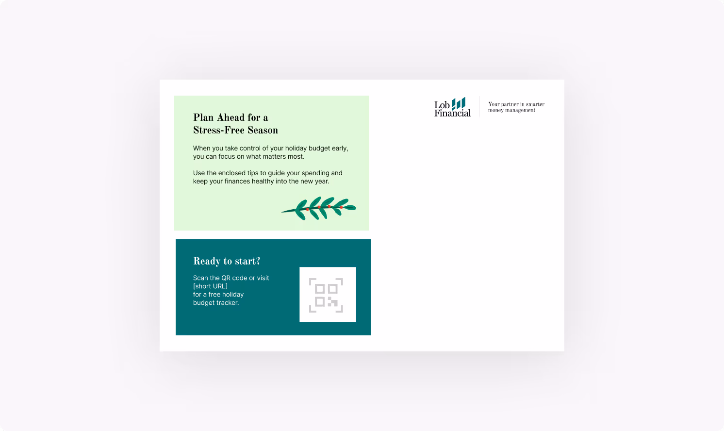 Give customers a quick, actionable way to stay in control of holiday spending. This postcard highlights simple budgeting reminders that help recipients prioritize what matters most and avoid common seasonal overspending pitfalls. Position your brand as a supportive financial partner who’s there when it counts.
