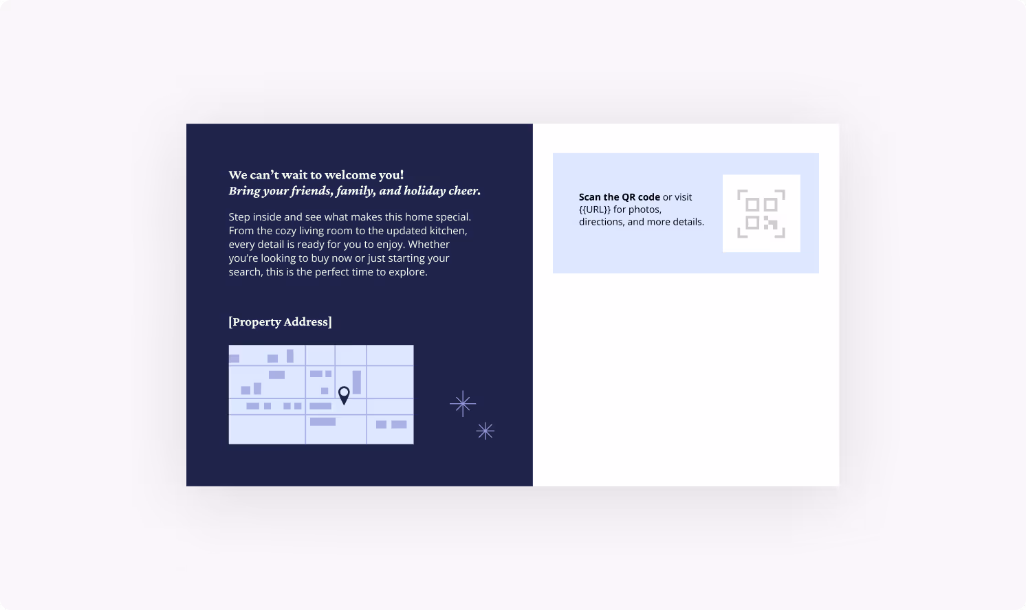 Use high-quality, well-lit photos of the property and highlight any unique seasonal touches. Consider adding a QR code that links to a virtual tour or more event details.